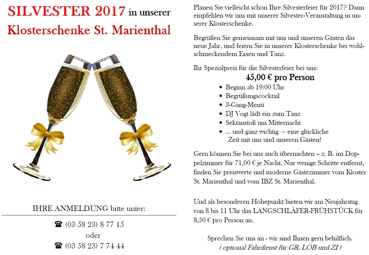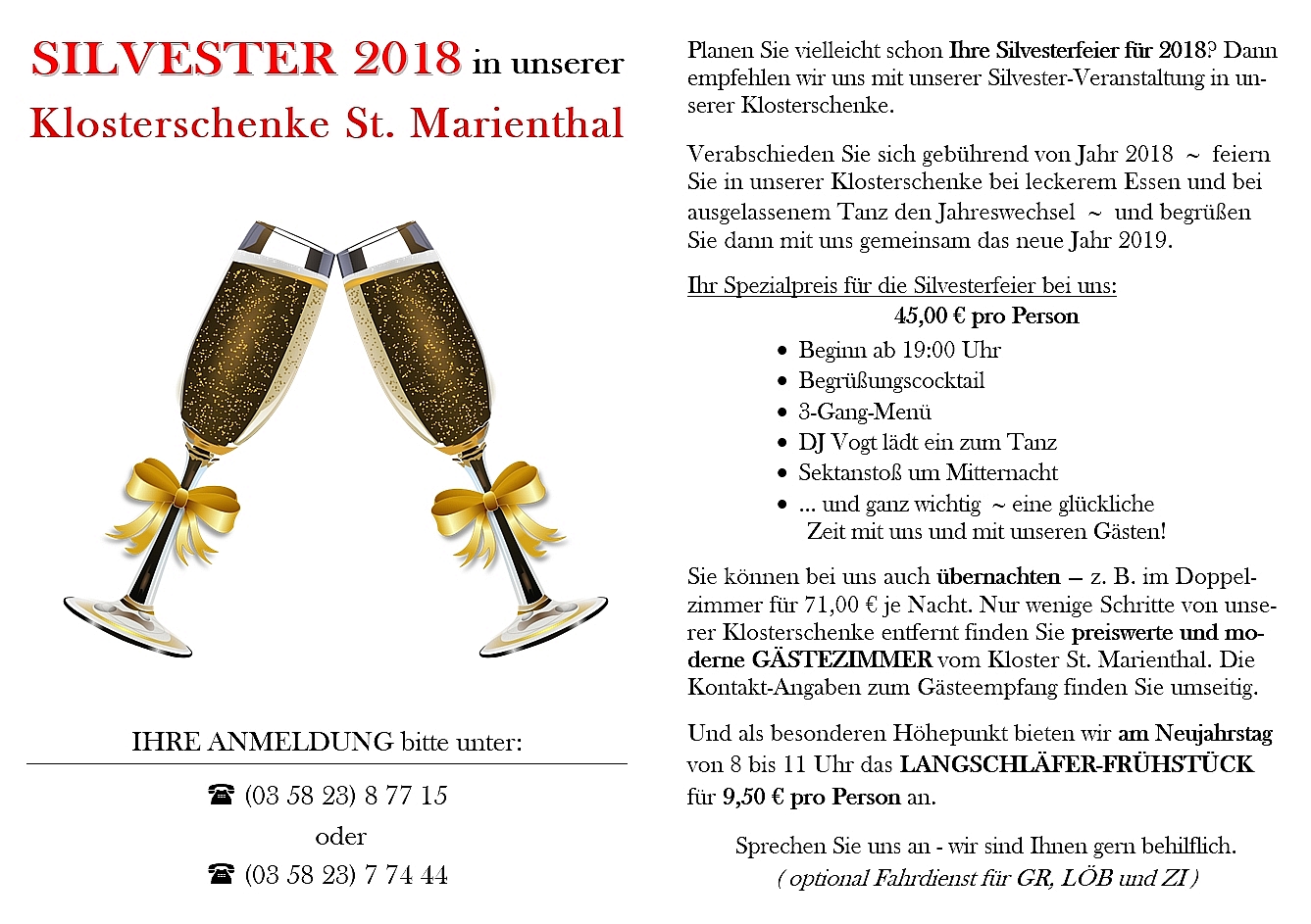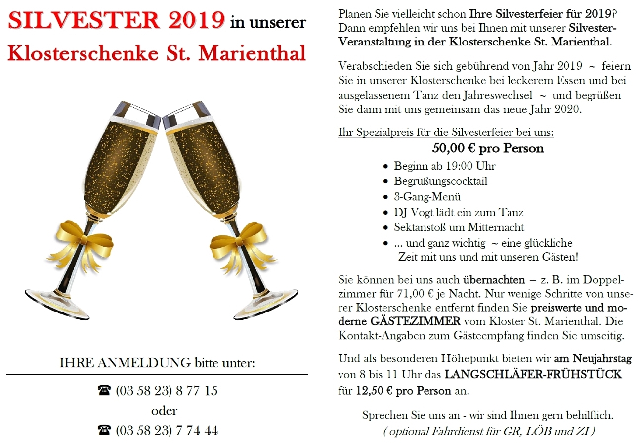 Und vor den Toren unseres Klosters gelegen, lädt Sie unsere „Klosterschenke St. Marienthal“ ganz herzlich zur Einkehr und zum Verweilen ein.