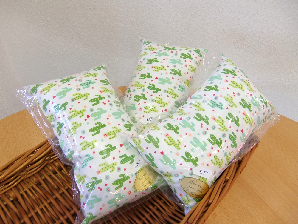 Kuschelkissen aus unserer Klosternähstube ~ echte Handarbeit ~ LINKS: Kuschelkissen "Teddy, Ball und Elefant" ca. 20 x 23 cm 5,50 Euro RECHTS: Kuschelkissen "Kaktus"