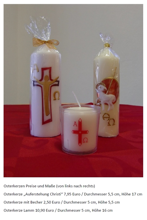 Mitte: Osterkerze mit Becher: 2,50 Euro Durchmesser 5 cm, Höhe 5,5 cm rechts: Osterkerze Lamm 10,90 Euro Durchmesser 5 cm, Höhe 16 cm >>> Informationen - unsere Osterkerzen